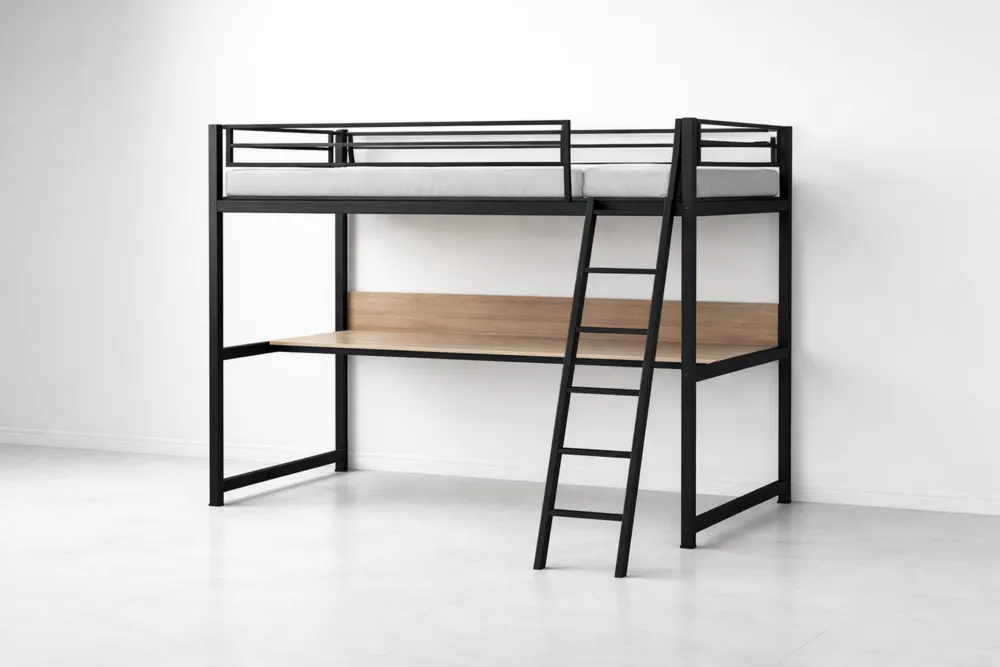 Ce lit mezzanine en acier peint noir est conçu avec un bureau en panneau de particules intégré en dessous. La structure principale est en acier tubulaire.Dimensions : 210 cm de longueur, 157 cm de largeur, 182 cm de hauteur.Poids maximum supporté : 150 kg.